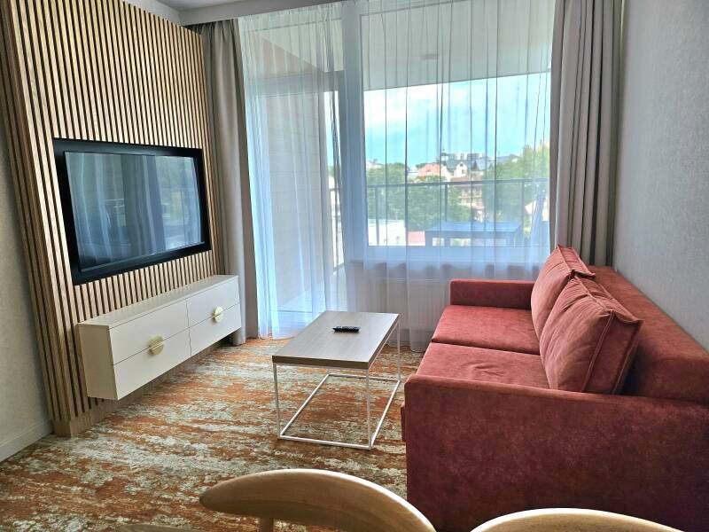 Die Ferienwohnung befindet sich in einem im Jahr 2023 fertig gestellten Teilgebäude eines Hotelkomplexes mit vielen Annehmlichkeiten. Im Hotel kann gegen eine kleine Gebühr ein Hallenbad und eine Sauna genutzt werden. Gastronomische Einrichtungen sind im Hotel ebenfalls vorhanden. Auch gelangt man über mehrere Lifte von der Tiefgarage direkt zur Ferienwohnung.